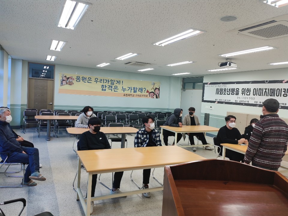 2020-2학기 2차 스마트IT 학생 지원 프로그램(ITSAP : IT Student Assist Program) 운영 ▶ IT 커리어 관리 프로세스 - 4학년:자격증, 이력서, 자소서, 포트폴리오 - 3학년:프로젝트, 공모전준비, SW설계구현 - 2학년:IT동아리, 배움공동체, 해외연수 - 1학년:봉사활동, 격주 자기주도 동아리활동 ▶ 교육과정 개선 활동 및 재학생 관리 - 실시간 소통 강화(학생-교수, 선배-후배, 상담 및 비교과지도) - 상담(학교생활, 출석, 비대면 수업 개선사항, 취업, 휴복학 등) - 1학년 3명, 2학년 5명, 3학년 14명, 교수3명, 조교1명 참여 ▶ 2020 학년별 앨범제작 경진대회 및 스마트IT리그 게임대회 시상식 진행 ▶ 프로그램 진행뒤 즐거운 회식~~~